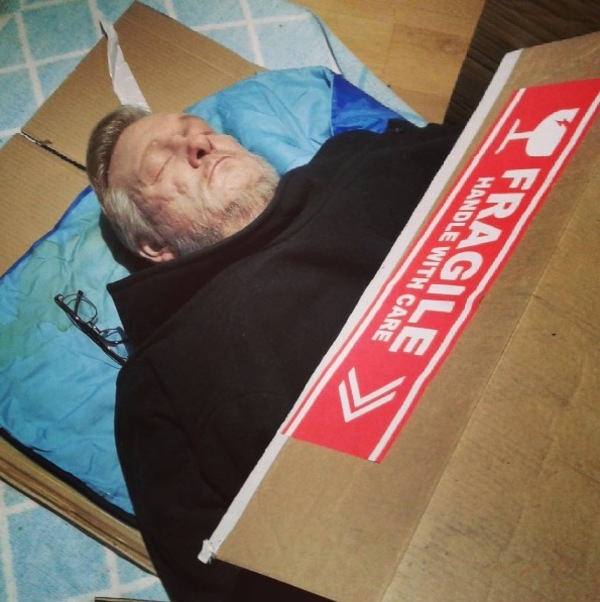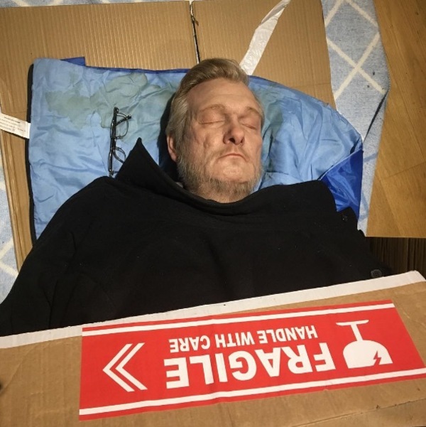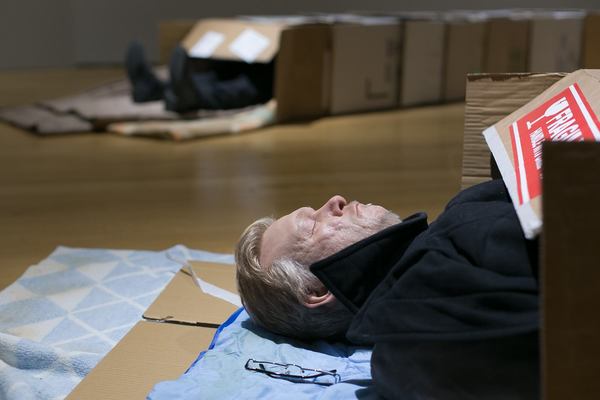 Yerde yatan evsiz adam gerçek değil.