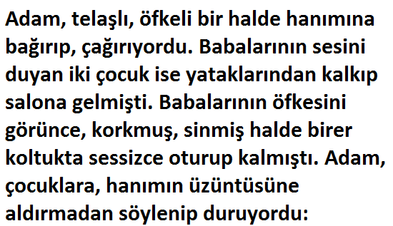 Birden aklına eşinin eski işi geldi. Geri dönmesini isteyecekti. Ama bunu ona nasıl söyleyecekti, çünkü artık çok kırılgan ve neşesizdi. Bütün cesaretini toplayarak akşam karısına konuyu açtı.