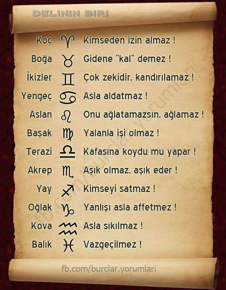İkizler: İki değil 10 kadın yaşar içinde, en tekinsiz burçtur, gülüp eğlenirken Medyum Memiş gibi zumzuğu ağzınıza çakabilir. Gönlünü hoş tutan erkekleri bünyesi reddeder, onu kanırtan, sinir hastası eden adamlara aşık olur. Konuşkan ve eğlencelidir, seyahate bayılır. İkizler kadınıyla yemeğe giderseniz 3 saatten önce yemeğinizin gelmemesi garantidir. -Tavuk var mı var, -makarna var mı var -ben lüfer aliym o zaman, diye sipariş verir. Bir mekanda bir yemek geri gönderiliyorsa arkasındaki kadın muhakkak ikizler burcudur. Yaşını göstermeyen narin ve zarif bir yapıları vardır, en geç yaşlanan burç ikizlerdir. Herkese şarladıkları, içlerinde bişey tutmadıkları için yaşlanmamaları doğaldır. Ohh iyi yapıyolar valla biz tuttuk da noolduu ayynen devam.