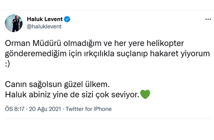 “Orman Müdürü olmadığım ve her yere helikopter gönderemediğim için ırkçılıkla suçlanıp hakaret yiyorum 🙂 Canın sağolsun güzel ülkem. Haluk abiniz yine de sizi çok seviyor.”