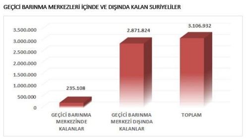 Raporda göre, Türkiye’deki Suriyeli mülteci sayısı, 3 milyon 106 bin 932 kişi. Suriyeli sığınmacıların 235 bin 108’i eçici barınma merkezlerinde kalırken, 3 milyon 106 bin 932 kişi ise 81 farklı ile dağılmış durumda.
