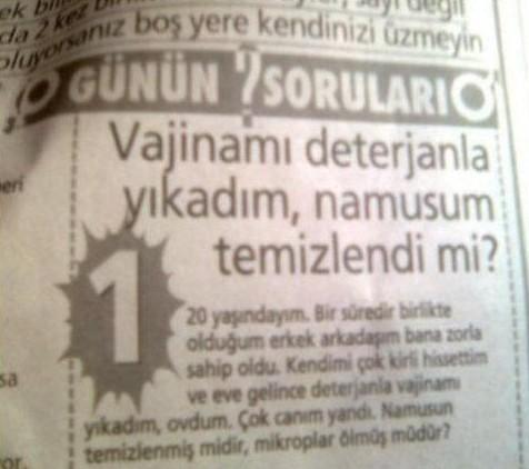“Vajinamı deterjanla yıkadım, namusum temizlendi mi?” Önceki görselSonraki görsel Add a Comment Yanıtı iptal etYorum yapabilmek için oturum açmalısınız.