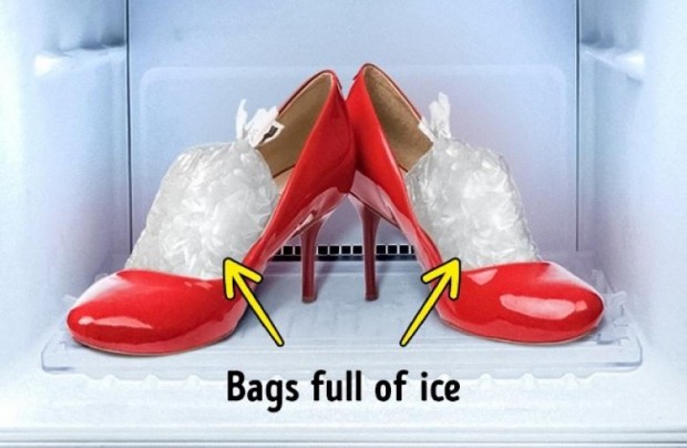 2. Sıkan ayakkabıların içine buz doldurduğunuz poşet koyun ve buzluğa atın. Burada 1 gün bekletin.