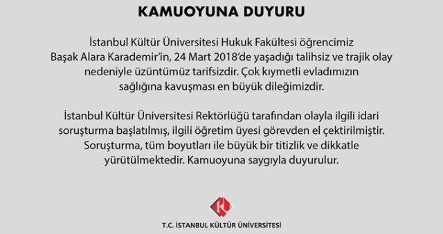 İstanbul’daki özel bir üniversitenin hukuk fakültesinde 3’üncü sınıf öğrencisi olan 21 yaşındaki Alara K., okulun Ankara’ya düzenlediği geziye katıldı. İddiaya göre, gittikleri eğlencenin ardından öğrencilerin kaldığı otelde Alara K. ile geziye görevli olarak katılan hocalardan Yrd. Doç. H.A.G. arasında tartışma çıktı. Olay sonrası gece 03.00 sıralarında hocasının oteldeki odasına giden genç kız, kendini tuvalete kilitledi. Lobiye inen H.A.G., görevlilerden yardım isteyerek tuvalet kapısını açtırdı. Ancak Alara K., duşakabinin üst demirine asılmış halde bulundu. Hastaneye kaldırılan genç kızın hayati tehlikesi sürüyor.