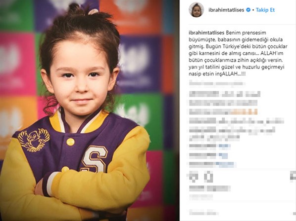 Tatlıses’in dikkat çeken instagram paylaşımı şöyle: “Benim prensesim büyümüş de babasının gidemediği okula gitmiş. Türkiye’deki bütün çocuklar gibi karnesini de almış canısı. Allah’ım bütün çocuklarımıza zihin açıklığı versin, yarı yıl tatilini güzel ve huzurlu geçirmeyi nasip etsin inşallah.”