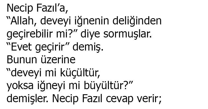 Gerekirse burada yatacağım.” Daha bir sinirlenen genel müdür; “Kardeşim sen yoktan anlamaz mısın? Yok diyoruz sana yok… Haydi, çıkar cebinden bana bir elma ver !” Genel müdürün maksadı işin olmazlığını izah etmektir.