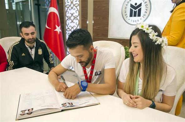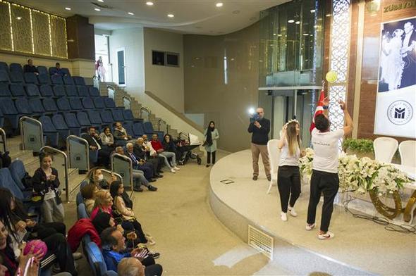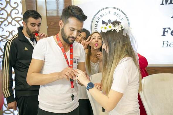 İzmir Marşı ile salona giriş yapan Umut ve Aycan çifti daha sonra nikâh masasına oturdu. Nikâh memuru “Eş olarak kabul ediyor musunuz?” sorusuna gelin ve damadın “Evet” cevabını vermesi üzerine davetliler alkış yerine düdük çalarak destek verdi. Çift, nikâhın kıyılmasının ardından gelin çiçeği yerine masada bulunan topları davetlilere attı.