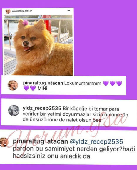 “Bir köpeğe bir tomar para verirler bir yetimi doyurmazlar sizin ünlünüz de ünsüzününe de nalet olsun bee” notunu yazan takipçisine Pınar Altuğ, “Pardon bu samimiyet nereden geliyor? Hadi hadsizsiniz onu anladık da” yazarak sert bir dille cevap verdi