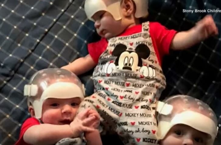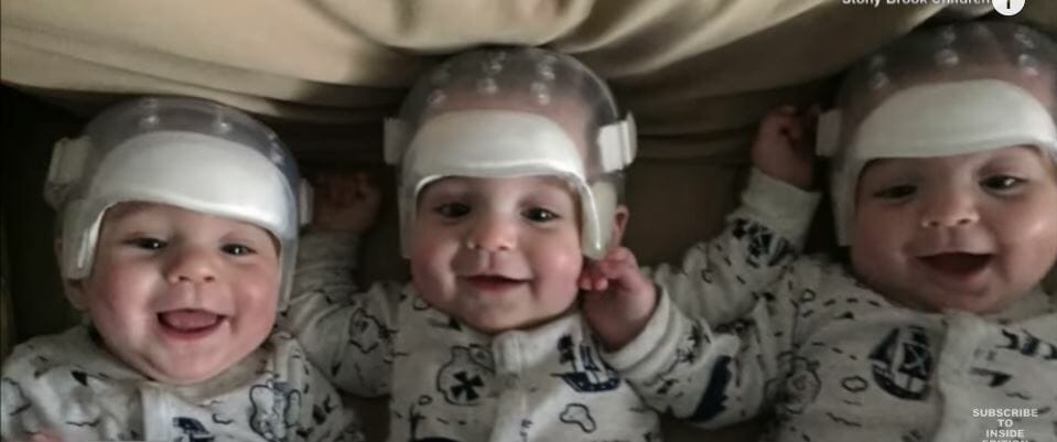 Üçüzlerin her birine, kafataslarının yanlış şekilde gelişmemesi için koruyucu kask takıldı.