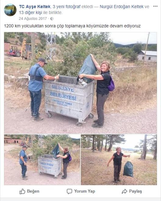 Ayşe Keltek, Facebook’taki sayfasında çevreci faaliyetlerini de fotoğraflarla paylaşıyordu. Fotoğrafların altına da şunları yazdı: “1200 km yolculuktan sonra çöp toplamaya köyümüzde devam ediyoruz”, “Bugün 20 km yol yürüdükten sonra bu kadar çöp toplayabildik.”