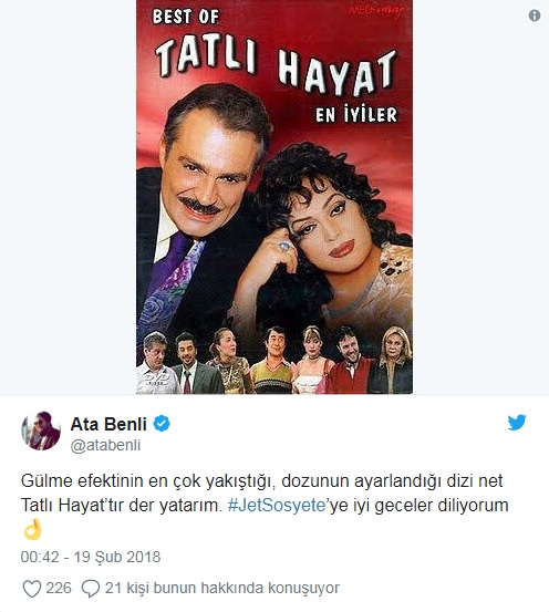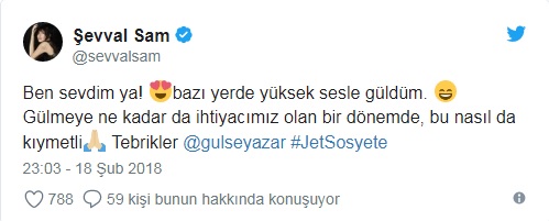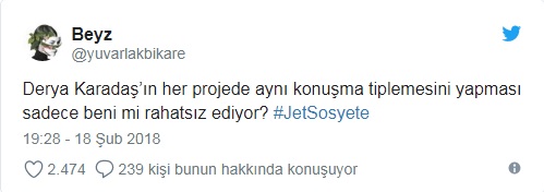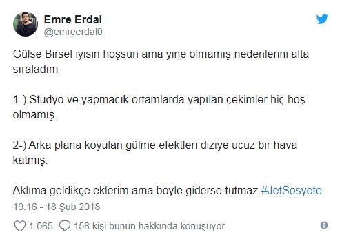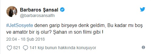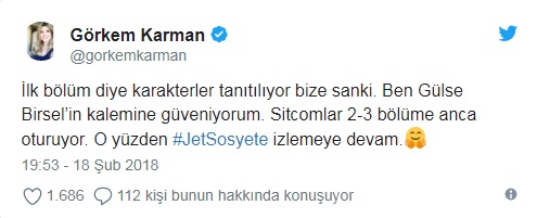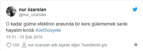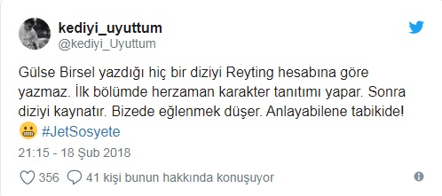 Jet Sosyete yeni bölüm yani 2. bölüm fragmanı henüz yayınlanmış değil. Başrollerinde Çağlar Çorumlu, Derya Karadaş, Cengiz Bozkurt, Gülse Birsel, Sarp Apak, Ayşenil Şamlıoğlu, Bartu Küçükçağlayan, Aslı Bekiroğlu, Hasibe Eren, Enis Arıkan’ın yer aldığı ve BKM’nin yapımcılığını üstlendiği Jet Sosyete’nin; yönetmeni Hakan Algül. Avrupa Yakası ve Yalan Dünya dizilerinin ardından Jet Sosyete’nin nasıl bir performans sergileyeceği merak konusuydu ve sosyal medyadan değişik tepkiler aldı. İşte o tepkiler…