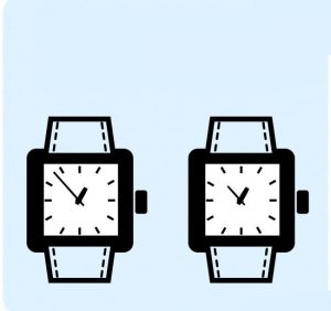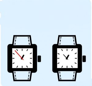 Soldaki saat oyuncak. Çünkü yelkovanı saatin etrafında tam tur atamayacak kadar büyük.