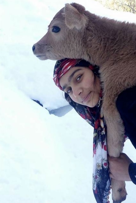 RİZE’nin İkizdere İlçesi’nde yeni doğum yapan keçiyi sırtına aldığı fotoğrafın sosyal medyada yayılmasıyla gündeme gelen Hamdu Sena Bilgin (12), hasta buzağısı ile bir fotoğraf paylaştı.