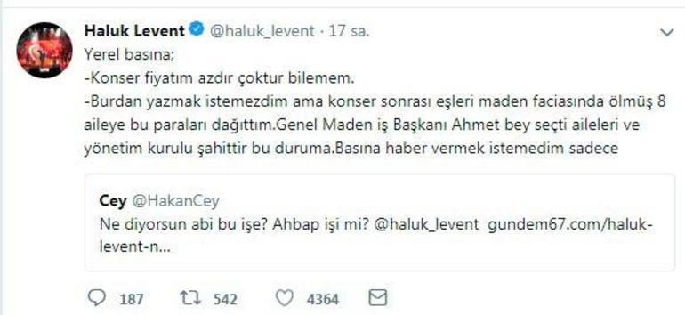 Haluk Levent, eleştirilere sosyal medya üzerinden yanı verdi. Haluk Levent açıklamasında, “Konser fiyatım azdır çoktur bilemem. Buradan yazmak istemezdim ama konser sonrası eşleri maden faciasında ölmüş 8 aileye bu paraları dağıttım. Genel Maden İş Başkanı Ahmet Bey seçti aileleri ve yönetim kurulu şahittir bu duruma. Basına haber vermek istemedim sadece. Haber yalan değil, meblağ doğru ama yorumlar kötü geldi o çevreden. Bu sebeple açıklama yapmak zorunda kaldım” ifadelerini kullandı.