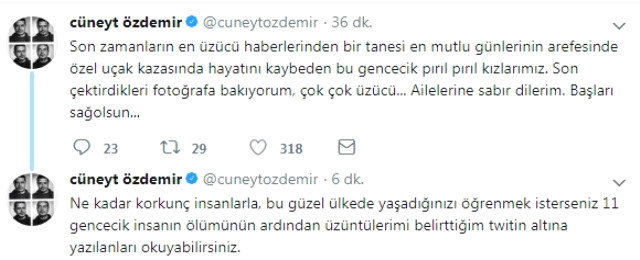 İşadamı Hüseyin Başaran’ın 14 Nisan’da evlenecek olan kızı Mina, bekarlığa veda partisi için 7 kız arkadaşıyla birlikte özel jetiyle Dubai’ye gitmişti. İstanbul’a dönüşte jet, İran’da dağa çakıldı. 3’ü mürettebat 11 kadın öldü. Böylesine büyük bir acının ardından sosyal medya hesaplarından çirkin yorumlar yapanların sayısı bir hayli fazla oldu. Ölüm üzerinden yapılan bu çirkinliğe tepki gösteren isimlerse sosyal medya hesaplarından şu paylaşımları yaptı:
