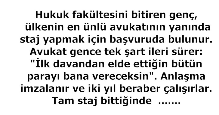 Hukuk fakültesini bitiren genç, ülkenin en ünlü avukatının yanında staj yapmak için başvuruda bulunur. Avukat gence tek şart ileri sürer: “İlk davandan elde ettiğin bütün parayı bana vereceksin”. Anlaşma imzalanır ve iki yıl beraber çalışırlar. Tam staj bittiğinde genç anlaşmayı haksız bulduğunu, ilk davadan kazandığı parayı ona vermeyeceğini açıklar. Avukat tazminat talebi ile mahkemeye başvurur.