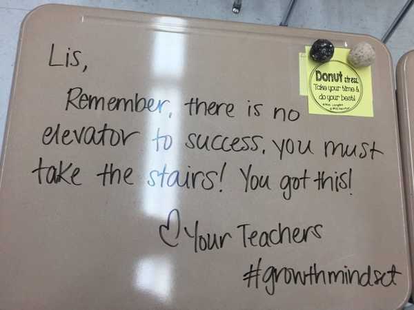 Öğretmenleri Chandni Langford öğrecilerinin üzerindeki baskıyı tahmin edebiliyordu ve onları motive etmesi için sıralarının üzerine ilham verici yazılar yazdı. Her öğrenciye özel bir mesaj yazdı.
