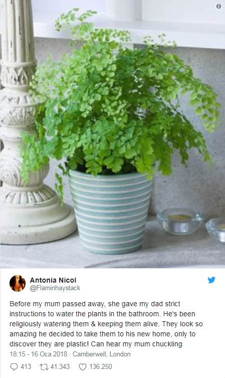 Hikayeyi heyecanla paylaşan Antonia, “Annem ölmeden önce babamdan banyodaki bitkileri sulaması için sıkı talimatlar verdi.” ifadelerini kullanarak babasının taşınması sırasında bitkilerin sahte olduğunu farkettiğini takipçileriyle paylaşan bir tweet attı. Tweete babasının sahte bir eğrelti otunu sulayan bir fotoğraf da iliştirdi. Antonia’nın paylaşımı bir anda viral oldu ve 130 bin kez beğenildi 40 bin kezde retweet’lendi.