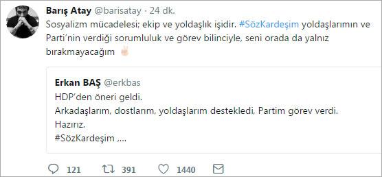 Barış Atay da Erkan Baş’ın tweetini alıntılayarak, “Sosyalizm mücadelesi; ekip ve yoldaşlık işidir. #SözKardeşim yoldaşlarımın ve Parti’nin verdiği sorumluluk ve görev bilinciyle, seni orada da yalnız bırakmayacağım” ifadelerini kullandı.
