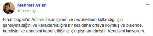 Nihat Doğan’ı çok sert sözlerle eleştiren Mehmet Aslan, “Nihat Doğan’ın adımızı insanlığımızı ve nezaketimizi kullandığı için şahsiyetsizliğini ve karaktersizliğini bir kez daha ortaya koymuş ve bizleri de, kendisini ve annesini kabul ettiğimiz için pişman etmiştir. Kendisini kınıyorum.” dedi.