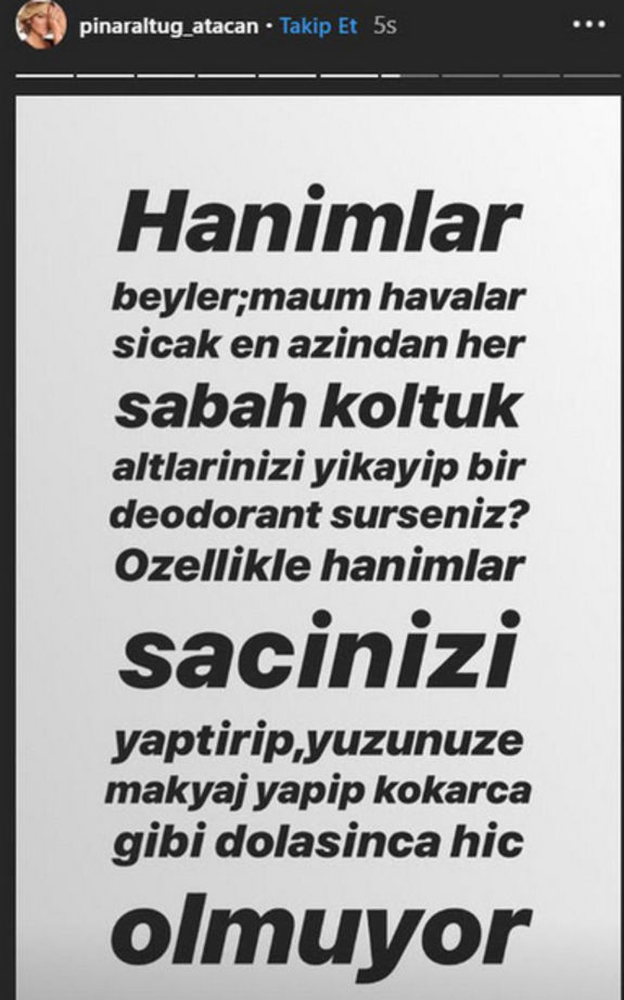 Sosyal medya hesabından yaptığı paylaşımlar ve takipçilerine verdikleri yanıtlar ile adından söz ettiren oyuncu Pınar Altuğ, bu kez takipçilerini uyardı. Altuğ, “Hanımlar, beyler… Malum havalar sıcak. En azından her sabah koltuk altlarınızı yıkayıp, bir deodorant sürseniz? Özellikle hanımlar; saçınızı yaptırıp, yüzünüze makyaj yapıp kokarca gibi dolaşınca hiç olmuyor” ifadelerini kullandı
