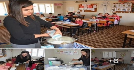 Şanlıurfa’nın Siverek ilçesinde görev yapan öğretmen Ece Koyun, odun sobası üzerinde hazırladığı pudingi öğrencilerine ikram ediyor. Ece Öğretmen, ders bittikten sonra hazırladığı pudingi, sabırsızlıkla bekleyen minik öğrencilerine dağıtıyor.