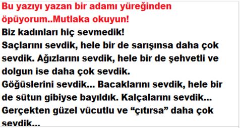 Biz kadınları hiç sevmedik! Saçlarını sevdik, hele bir de sarışınsa daha çok sevdik Ağızlarını sevdik, hele bir de şehvetli ve dolgun ise daha çok sevdik. Göğüslerini sevdik… Bacaklarını sevdik, hele bir de sütun gibiyse bayıldık. Kalçalarını sevdik… Gerçekten güzel vücutlu ve “çıtırsa” daha çok sevdik… Yolda, arabada, televizyonda, internette onlara hep “baktık” Her yerlerine iyice