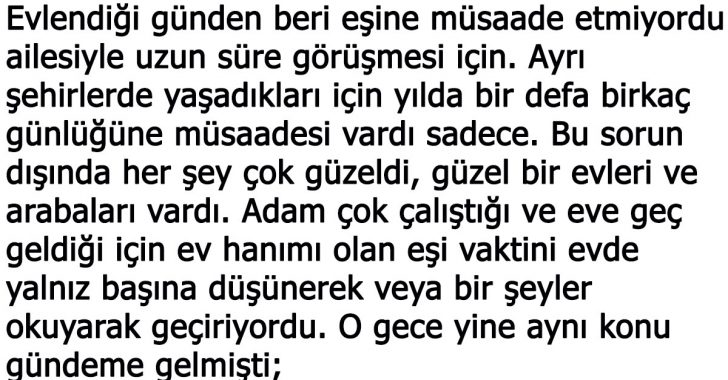 Evlendiği günden beri eşine müsaade etmiyordu ailesiyle uzun süre görüşmesi için. Ayrı şehirlerde yaşadıkları için yılda bir defa birkaç günlüğüne müsaadesi vardı sadece. Bu sorun dışında her şey çok güzeldi, güzel bir evleri ve arabaları vardı. Adam çok çalıştığı ve eve geç geldiği için ev hanımı olan eşi vaktini evde yalnız başına düşünerek veya bir