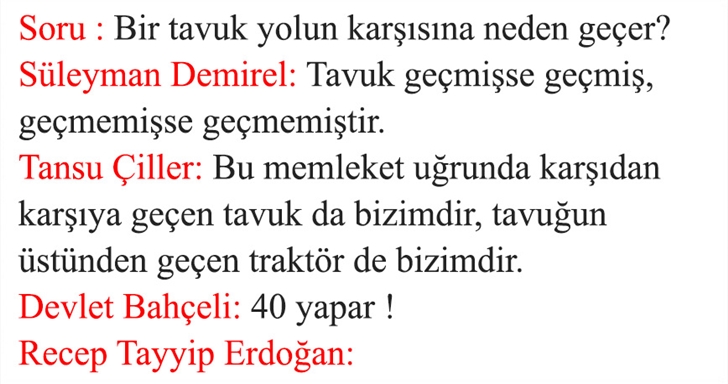 “Bir tavuk yolun karşısına neden geçer?” sorusuna siyasi liderlerin vereceği muhtemel cevaplar şöyle olurdu Süleyman Demirel : Tavuk geçmişse geçmiş, geçmemişse geçmemiştir. Tansu Çiller : Bu memleket uğrunda karşıdan karşıya geçen tavuk da bizimdir, tavuğun üstünden geçen traktör de bizimdir. Bülent Arınç : Tavuğun karşıdan karşıya geçmesi çok manidardır. Recep Tayyip Erdoğan : Eyy tavuk!