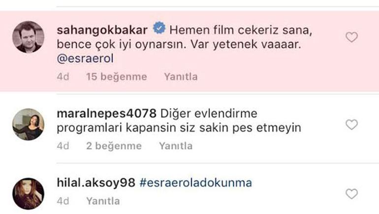 Şahan Gökbakar, Esra Erol’un Instagram sayfasına “hemen film çekeriz sana, bence çok iyi oynarsın” yazdı.