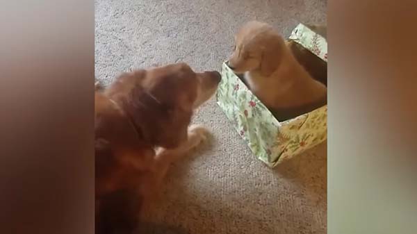 Sahibi kutuyu yere bırakınca Cash merakla kutuyu açmaya çalıştı. İçindekini görünce dünyanın en mutlu köpeği oldu.