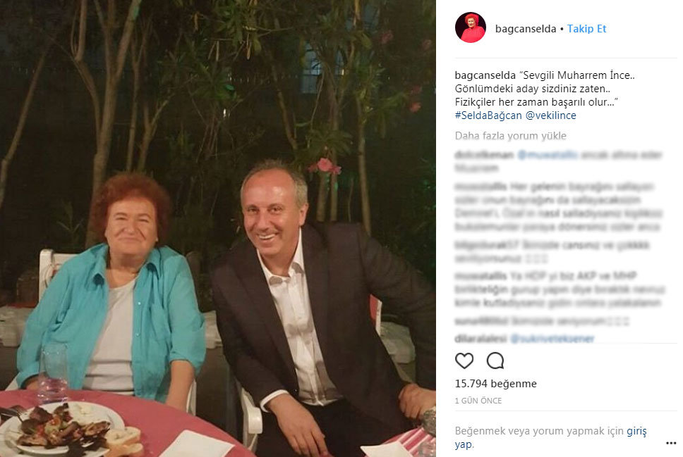 Selda Bağcan ile Muharrem İnce’nin yan yana olduğu fotoğrafın yer aldığı paylaşımda “Sevgili Muharrem İnce.. Gönlümdeki aday sizdiniz zaten.. Fizikçiler her zaman başarılı olur…” ifadeleri yer aldı