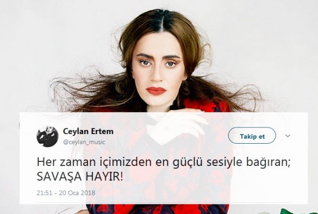 Ceylan Ertem, Zeytin Dalı Harekatı başladıktan sonra Twitter hesabından “Her zaman içimizden en güçlü sesiyle bağıran; SAVAŞA HAYIR!” paylaşımını yaptı.