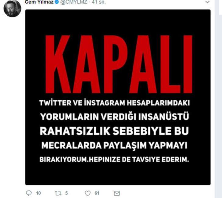 Ünlü şovmen Cem Yılmaz tüm sosyal medya hesaplarından paylaşım yapmayı bıraktığını yine bir sosyal medya paylaşımıyla duyurdu.