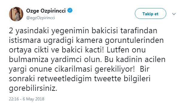 Özge Özpirinçci, sosyal medya hesabından 2 yaşındaki yeğeninin bakıcısı tarafından istismara uğradığını söyleyerek yardım istedi
