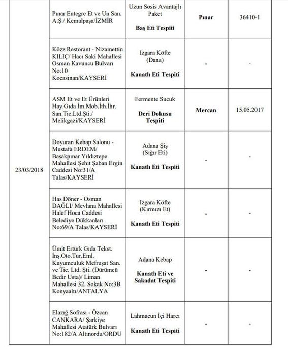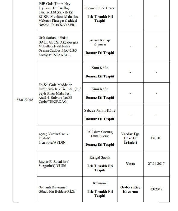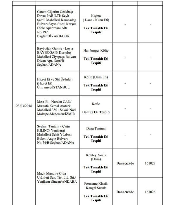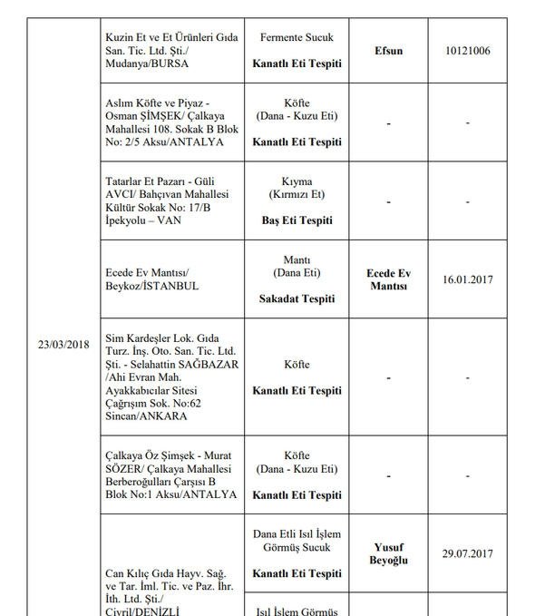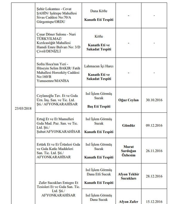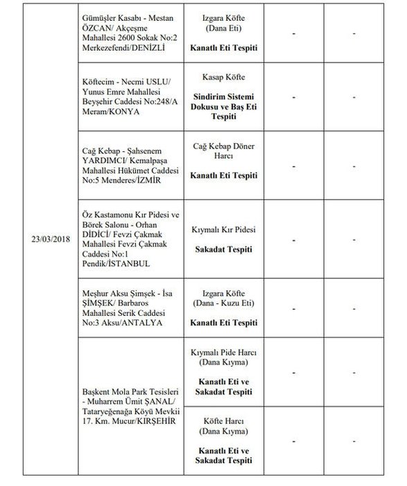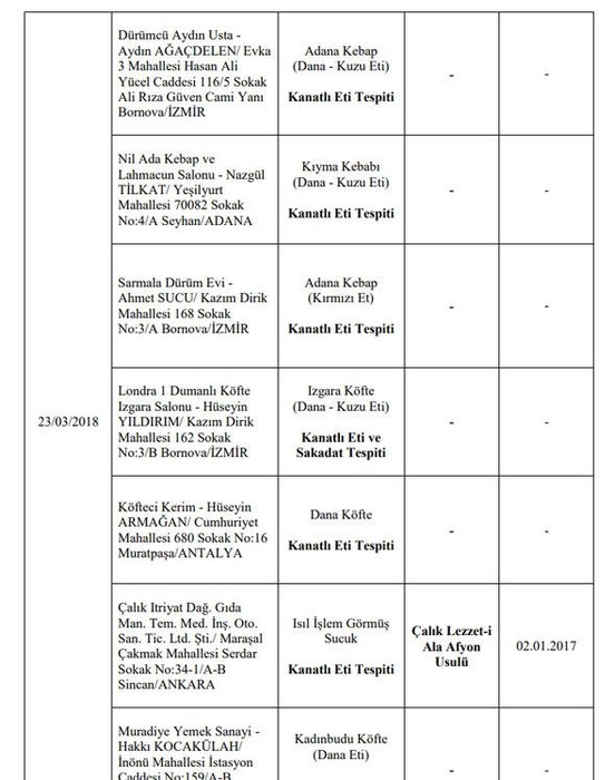 Listede tek tırnaklı ve domuz eti tespit edilen lokantalar da yer aldı.