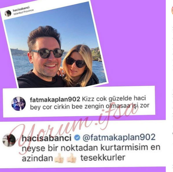 Geçen günlerde Hacı Sabancı Zeynep Nazlı Kayı ile birlikte olduğu bir fotoğrafı Instagram’dan paylaştı. Bir takipçisi, “Kız çok güzel de Hacı bey çok çirkin be. Zengin olmasa işi zor” mesajını yazdı. Hacı Sabancı’nın cevabı da, ” Neyse bir noktadan kurtarmışım en azından. Teşekkürler” oldu.