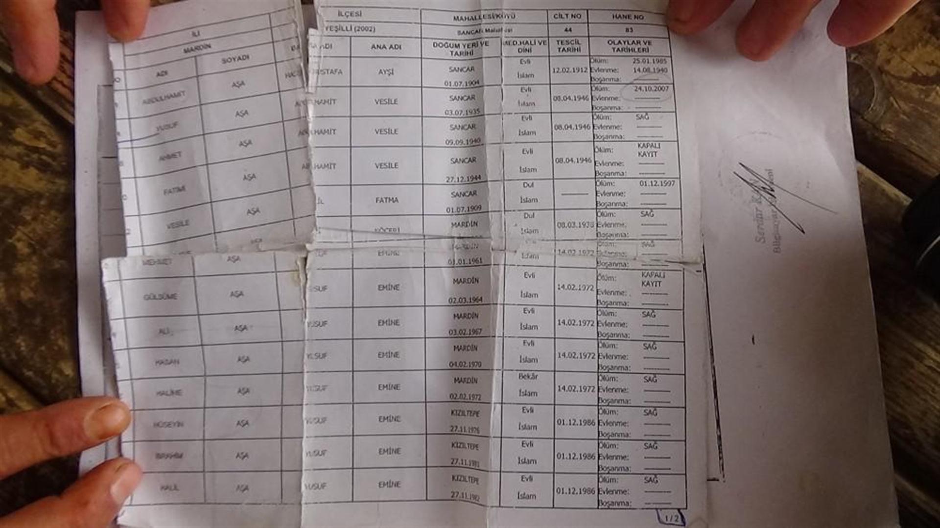 Babasının Yusuf, annesinin ise Emine olduğunu söyleyen Ali Aşa, “Dedemin adı Hamit, dedemin babasının adı Haso’dur. Haso’nun babasının adı da Mustafa’dır, Mustafa’nın babasının adı Ahmet’tir. Bazı aile fertleri kaybolmuşlar, kayıtlarda çıkmıyor. Sancar mahallesinden (köyünden) 1920 tarihinde kaybolmuşlar, 1914 tarihinde vergileri var, 1928-1952 tarihlerden arazilerin faturaları var. Eğer bu aileye ait olduğunu düşünen varsa ben tapuları mirasçıların bulunması için araştırma mahkemesine verdim. 2 yıldır mirasçı çıkmıyor bulamıyorum. Bu aileden geldiğini düşünen varsa mahkemeye müracaat etsin” dedi.