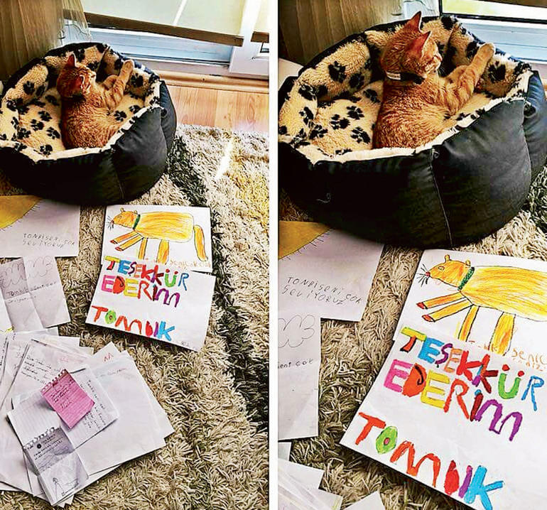 Okulun bahçesinde 9 kedi olduğunu, çocukların onları da çok sevdiğini söyleyen Özlem öğretmen Tombi’nin hikayesini ise şöyle anlattı: “Muhtemelen terk edilmiş bir kedi. Okulun bahçesindeki diğer kediler gibi değil, çocuklara çok yakın. Bahçede sıra olurken çocukların arkasında o da sıraya giriyor ve sınıfa çocuklarla birlikte giriyor. ‘Dikkat edin, koşmayın, Tombi ürker’ dediğimde söz dinliyorlar. Veliyi ikna etmek için çok çabaladık ama olmadı. Okulda tartışmaya dönüştü. Oysaki ben tüm aşılarını yaptırmıştım. Adına bütün sınıf birlikte karar vermiştik. Çocuklar gideceğini duyunca çok üzüldü. Milli eğitim müdürümüzün bu müjdesiyle her şey değişti, çocuklar Tombi’ye kavuşacaklar.”