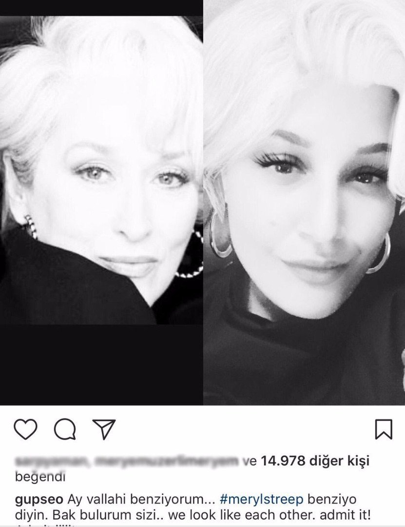 Sıra Gupse Özay’da. Sosyal medyada paylaştığı karşılaştırmalı fotoğrafta farklı bi tarza bürünen oyuncui kendisini dünyaca ünlü oyuncu Meryl Streep’e benzetti.