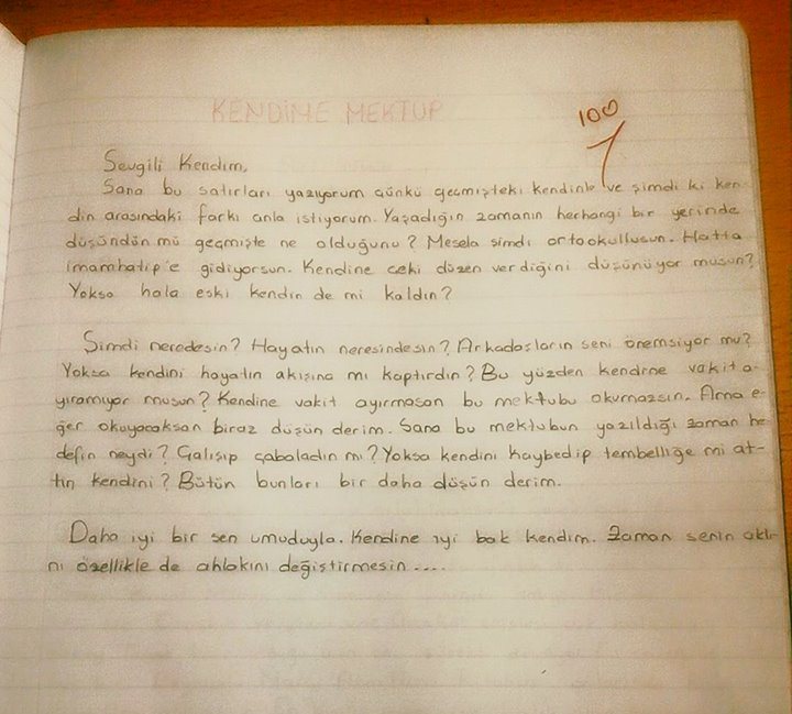 Kompozisyon dersinde Türkçe öğretmeni öğrencilerinden 20 yıl sonraki kendilerine yani geleceğe mektup yazmalarını istedi. Bir öğrenci o kadar güzel bir mektup yazdı ki Türkçe öğretmeni bu mektubu sosyal medyadan paylaştı. Mektubu okuyan herkes geleceğimizi teslim edeceğimiz çocuklarımızdan bir kez daha ümitlendi…