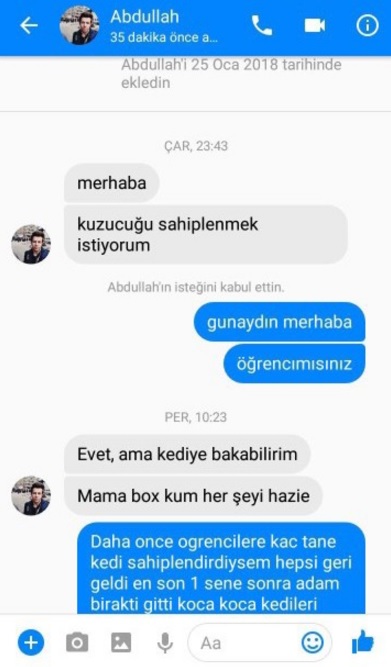 İsminin Abdullah Ç. olduğu öğrenilen bir genç, önce kedi sahiplenmek istediğini sosyal paylaşım sitesindeki sayfasında paylaştı.
