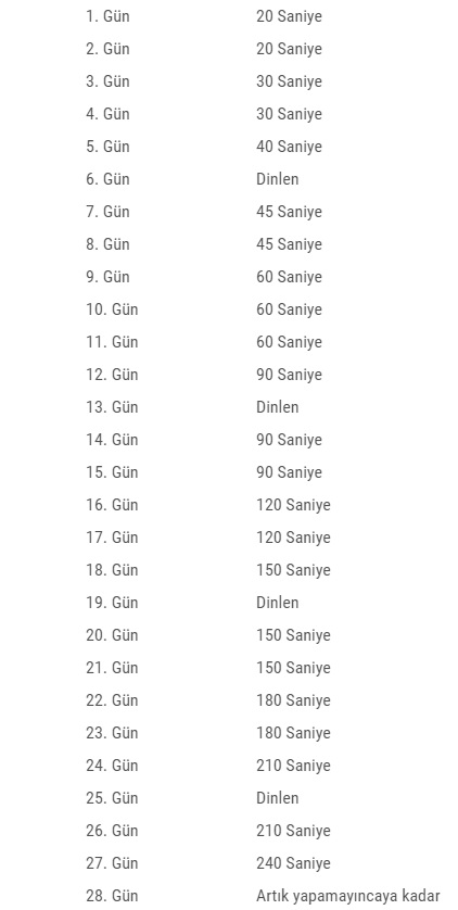 Bu bahsedilen sistem dört hafta içerisinde sonuç vaad ediyor. Başlangıçta Plank adı verilen hareketi sadece 20 saniye yapıyorsunuz. Kolay değil mi? Yavaşça son günlerinde 4 dakikaya ulaşabilecek şekilde gücünüzü artırıyorsunuz.