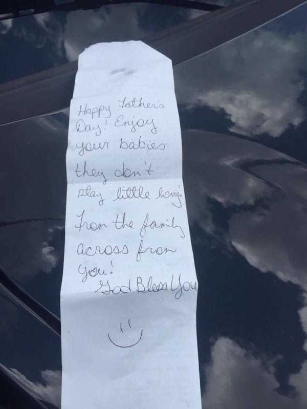 Geçen sene üçüzlerimizden birini kaybettik. Tatil yapamaz hale geldik. Bunu bilmediğiniz halde hesabımızı siz ödediniz. Yaptığınız jestin bizi ne kadar derinden etkilediğini tahmin bile edemezsiniz. Yaptığınız için minnettar olduğumu belirtmek istiyorum. Umarım ki bu yazıyı bir şekilde okursunuz ve bize ne kadar büyük bir iyilik yapmış olduğunuzu anlarsınız. Sayenizde eşim Babalar Günü’nü daha huzurlu geçirdi. Lütfen yazıyı paylaşarak notu yazan kişiye ulaşmasına yardımcı olun.”