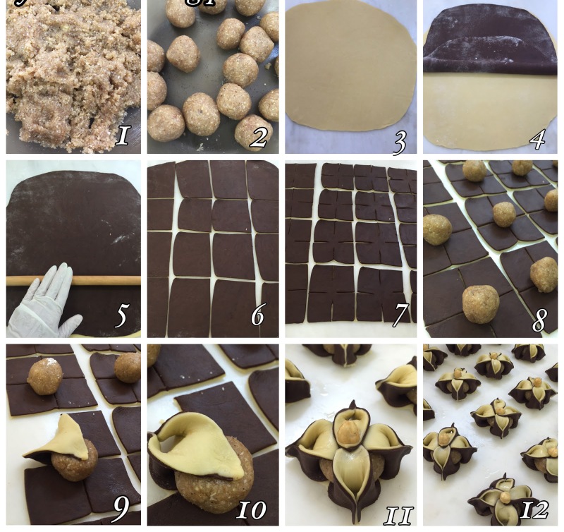 Bu arada iç malzemesi hazırlanır. Ceviz ve şeker robotta un haline gelene kadar çekilir. Sonra içerisine diğer malzemeler eklenir ve yoğrularak küçük toplar yapılır.1 kaşık nişastanın içerisine 1 kaşık un eklenir. Önce beyaz hamur nişastalı un karışmı ile kare olacak şekilde açılır. Sonra kakaolu hamur aynı büyüklükte açılır, ve beyaz hamurun üzerine koyulur. Karelere kesilir(16 adet ) ortasına iç harç konulur ve her karenin 4 tarafından ortaya kadar eşit kesilir ve resimdeki gibi şekil verilir. Orta kısmına şerbete veya yumurta akına batırılmış fındık konulur. Yağlı kâğıt serilmiş tepsiye dizilir önceden ısıtılmış 180⁰’de pişirilir. Tatlılar sıcakken soğuk şerbete batırıp çıkarılır ve servis tabağına alınır.