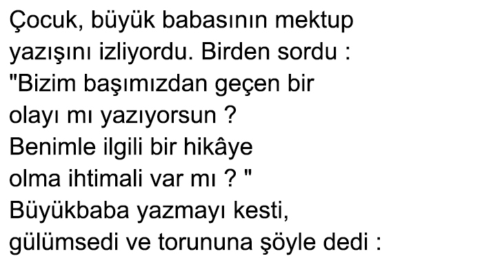 -İleride… çok yıllar sonra buradan oraya insanları götürebilmek ve orada yeni bir hayat kurabilmek için… Anladın mı? Küçük kızılderili şaşkınlığını gizlemeye çalışarak “Anladım” der ve koşa koşa uzaklaşır. Öyle hızlı koşmuştur ki, kampa geldiğinde konuşamaz haldedir. Hemen büyükbabasının yanına gider ve kendisine söylenenleri bir bir anlatır. Yaşlı kızılderili torununun anlattıklarını dinledikten sonra iyice sinirlenir, bağırıp çağırmaya başlar. Ertesi sabah yine torununu yanına çağırır, hayvan derisi üzerine kızgın bir çubukla ve kendi lisanınca yazdığı notu torununa uzatarak der ki;