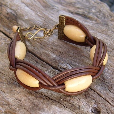 Homekahverengi derili boncuklu kelepçeli bileklik modeli