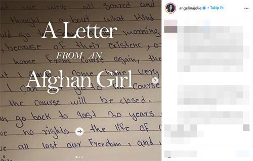 Aynı zamanda Birleşmiş Milletler Mülteciler Yüksek Komiserliği’nin (UNHCR) iyi niyet elçisi olan Jolie, bir Afgan kızın yazdığı mektubu paylaştığı ilk gönderisinde, 11 Eylül’den iki hafta önce Afganistan’da Taliban’dan kaçan Afgan mültecilerle görüştüğünü yazdı.Jolie, Afganların ülkelerini saran korku ve belirsizlik nedeniyle yeniden yurtlarından olmaları karşısında üzüntüsünü ifade etti.