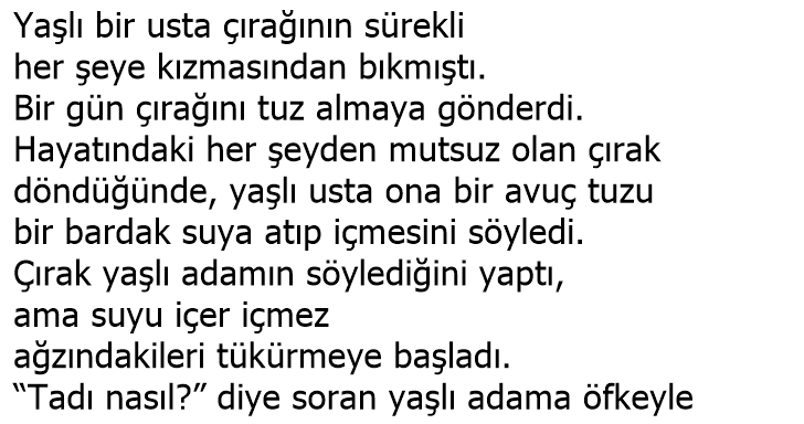 Tam küfesini yeniden sırtına almak üzereydi ki, kayanın eski yerinde bir kesenin durduğunu gördü. Açtı .. Kese altın doluydu. Bir de kralın notu vardı içinde ..”Bu altınlar kayayı yoldan çeken kişiye aittir” diyordu kral. Köylü, bugün dahi pek çoğumuzun farkında olmadığı bir ders almıştı.