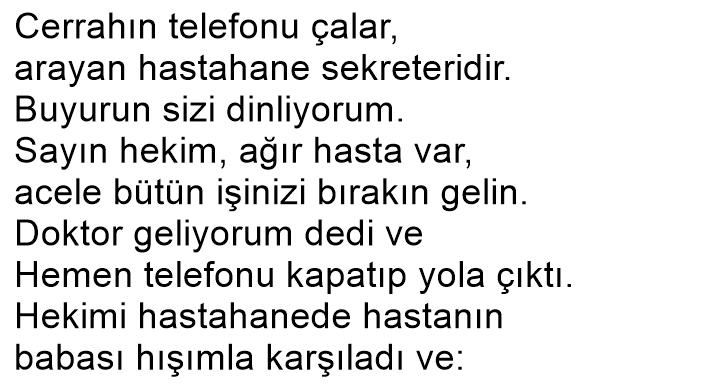 Yol kenarında eski bir evin kapısını çalıp hızla içeri girdi. Yaşlı bir kadın içeride oturuyordu. Süratle ona Sinirlendi ve “Telefonu verir misin telefon etmem lazım” dediğinde kadın tebessüm ederek dedi ki: “Görmüyor musun evladım ne telefonu. Burada ne telefon ne de elektrik var. Geç az dinlen, yemek ye, çay iç sonra düşünürsün bu işleri”